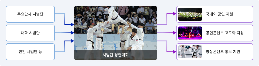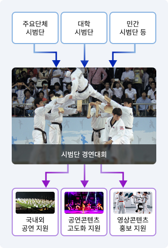 주요단체 시범단 / 대학 시범단 / 민간 시범단 등 > 시범단 경연대회 > 국내외 공연 지원 / 공연콘텐츠 고도화 지원 / 영상콘텐츠 홍보 지원