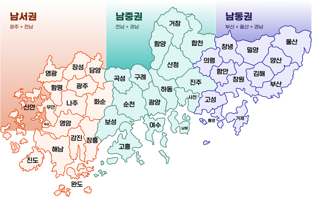 - 남중권(전남 + 경남) : 함양, 거창, 합천, 산청, 곡성, 구례, 하동, 진주, 보성, 순천, 광양, 사천, 고흥, 여수, 남해