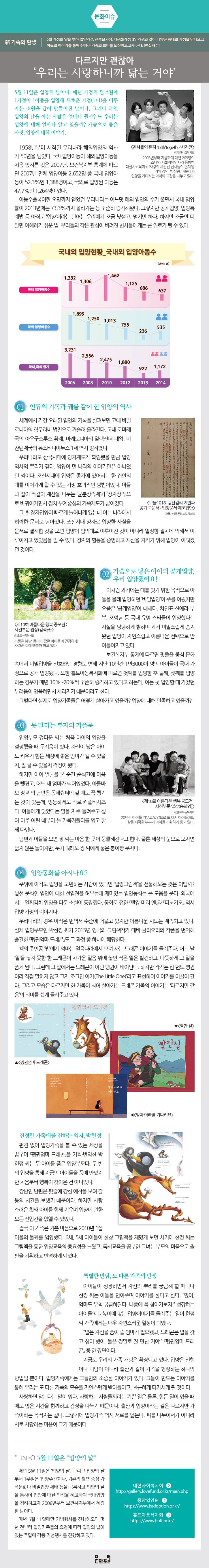 5월 11일은 입양의 날이다. 매년 가정의 달 5월에 1가정이 1아동을 입양해 새로운 가정(1+1)을 이루자는 소원을 담아 만들어진 날이다. 그러나 과연 입양의 날을 아는 사람은 얼마나 될까? 또 우리는 입양에 대해 얼마나 알고 있을까? 가슴으로 품은 사랑, 입양에 대한 이야기.