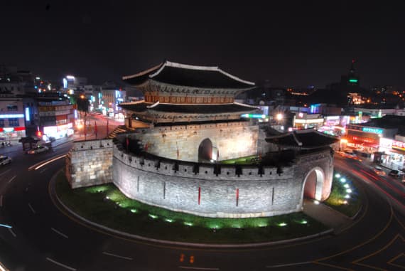 수원 팔달문 야경.정조가 아버지 사도세자의 능을 양주에서 화성(수원)으로 옮기면서 축성한 계획도시 화성의 남문.