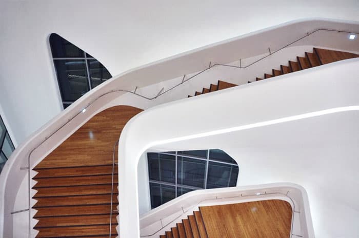 알림터, 배움터, 살림터 세 개의 독립된 공간으로 구성된 DDP는 특이한 외관은 물론 내부의 공간 구성도 창조적인 발상으로 만들어졌습니다. 특히 건물 내부에 조성된 디자인 둘레길은 총 533m로 이어지는 동선을 따라 곡선으로 이어져 있는데요. 한국의 자연처럼 서로 다투지 않고 물 흘러가듯 이어집니다. 특히 조형 계단은 DDP에서 상징적인 장소인데요. 구불구불 이어지는 계단의 모습이 인상적입니다. 지붕이 벽이 되고, 벽이 지붕이 되기도 합니다. 이곳저곳이따로 나뉘지 않고 열린 공간들이 이어져 있으며, 동선을 따라 오고 가며 상생하는 풍경이 담겨있습니다. 이처럼 건물 디자인을 구경하는 것만으로도 눈이 즐겁습니다.