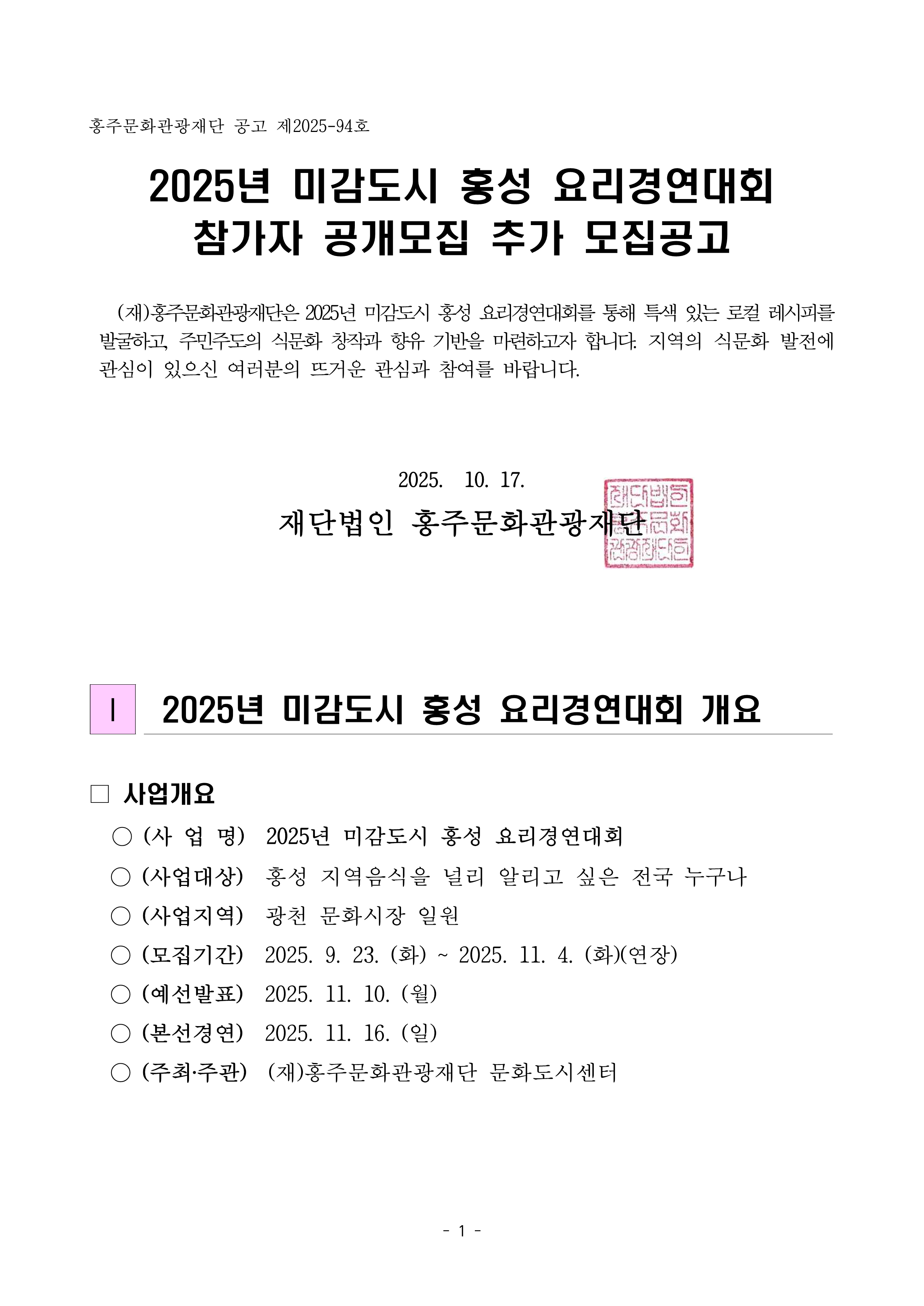 ○ 재단법인 홍주문화관광재단 문화도시센터 「2025년 대한민국 문화도시」2025년 미감도시 홍성 요리경연대회 참가자 모집과 관련하여