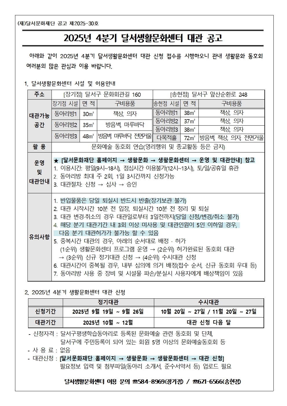 분야별 공모사업 및 지원사업 정보를 찾아보세요2025년 4분기 달서생활문화센터 대관 신청 공고